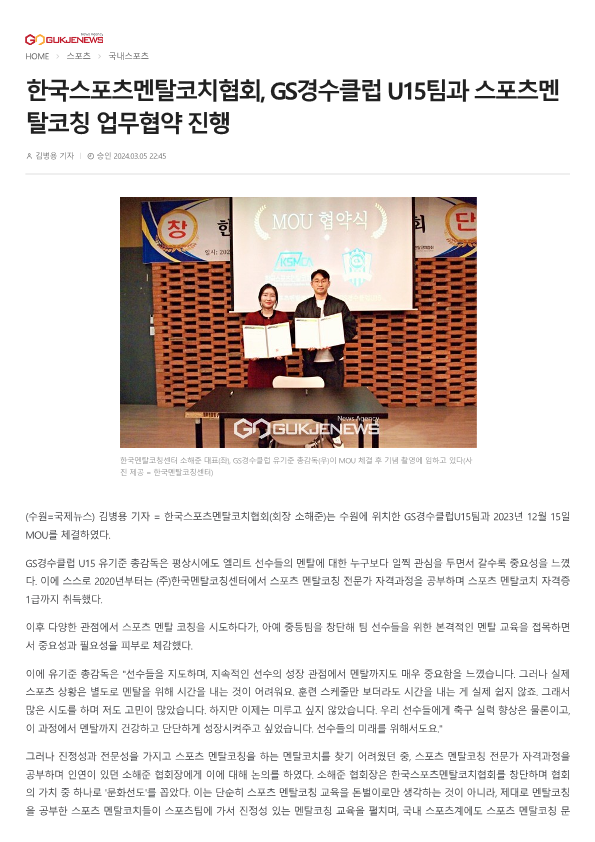 한국스포츠멘탈코치협회, GS경수클럽 U15팀과 스포츠멘탈코칭 업무협약...